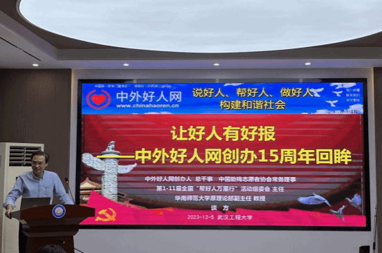 (通讯员:熊雪璟 张悦)12月5日晚,,,,,,中外好人网武汉服务处授牌聘用仪式暨大型思政选修课《加油中国》第五季第七讲在6731顶级娱乐求是楼112报告厅举行。。。。。。“中外好人网”开办人、华南师范大学谈方教授受邀主讲,,,,,,以“让好人有好报—中外好人网开办15周年回眸”为主题,,,,,,从什么是“中外好人网”、为什么要开办中外好人网以及中外好人网15年的生长历程和效果三个方面为各人做了详细阐释,,,,,,本次运动由6731顶级娱乐副院长常城教授主持。。。。。。