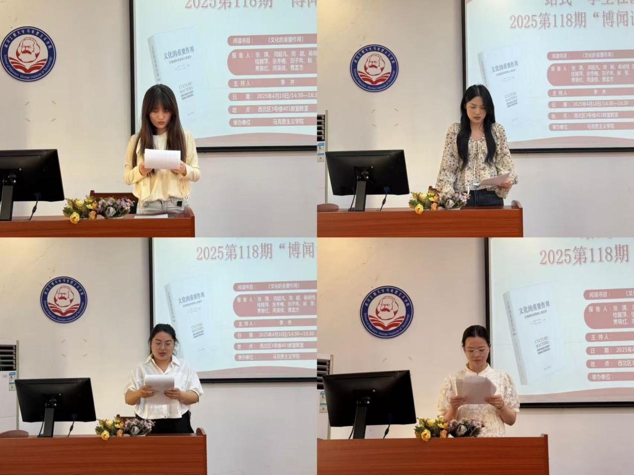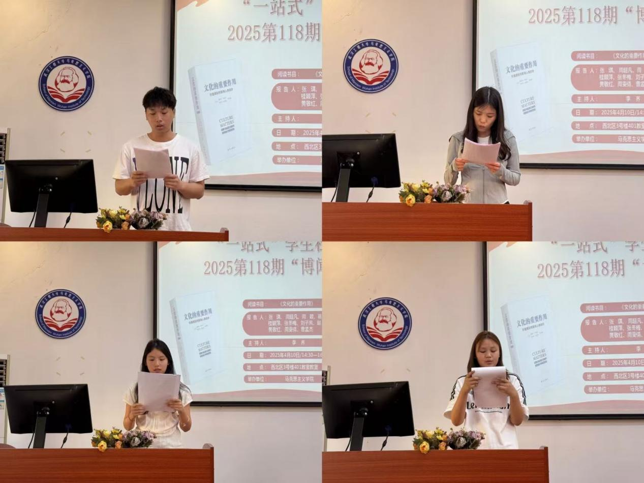 本网讯(通讯员 刘欣 张洋洋)4月10号下昼 ,,,,,,,我院第118期“博闻念书会”在6731顶级娱乐一站式学生社区中心(求是楼401课堂)顺遂召开。。。。。。。。本次念书会围绕着亨廷顿、哈里森的著作《文化的主要作用》睁开讨论。。。。。。。。本次念书会由李齐先生主持。。。。。。。。加入此次念书会的11位研究生主讲人为24级周雯情、张琪、周颖、周超凡、黄敬红、曹孟杰、刘子凤、张冬梅、葛明悦 、桂颖萍、赵芽。。。。。。。。院学术部“博闻念书会”运动小组组织了此次念书会。。。。。。。。
