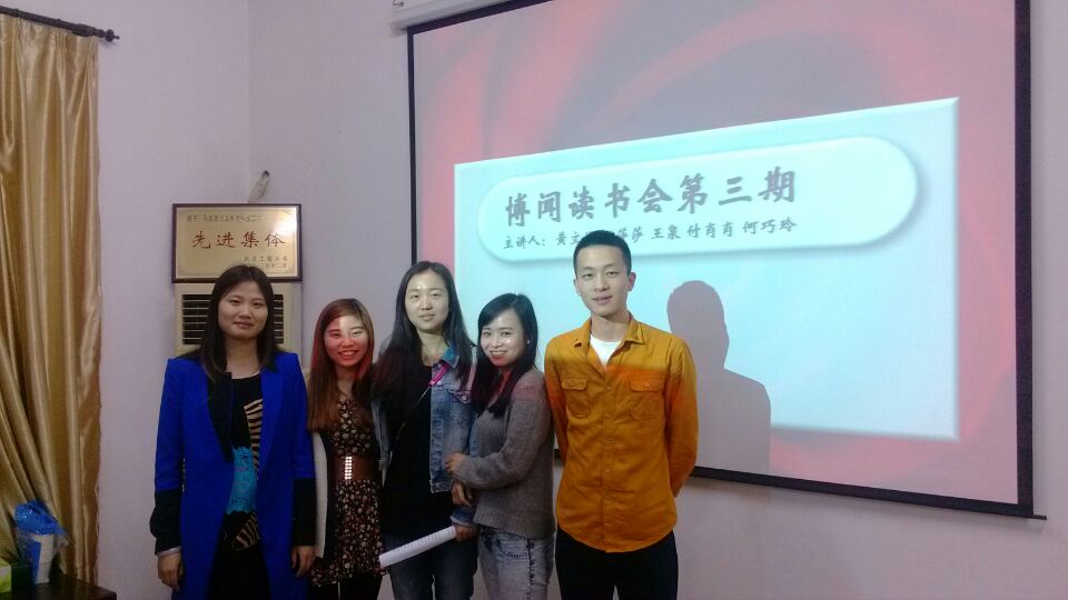 2014年4月23日,,,,,,6731顶级娱乐“博闻”念书会在学院聚会室顺遂举行。。。。。。。。本期念书会由我院学生会主席刘存地、学术部部长付肖肖主持,,,,,,组织学院研究生起劲加入。。。。。。。。本次念书会的主讲人划分是谢莎莎、王泉、黄文娟、何巧玲、付肖肖,,,,,,五位同砚以“选择绿色生涯,,,,,,离别十面‘霾’伏”为主题,,,,,,划分作了精彩生动的报告。。。。。。。。