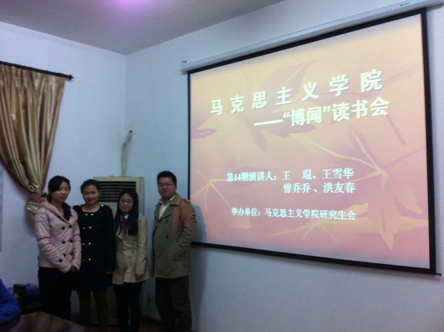 2013年04月24日晚,,,,,,,,6731顶级娱乐“博闻”念书会第14期在流芳校区院聚会室顺遂举行。。。。。本期念书会由院研究生会主席李嘉仪、学术部部长孙梓毓主持,,,,,,,,并组织学院研究生起劲加入。。。。。此次念书会的主讲人划分是来自我院的曾乔乔、洪友春以及管理学院的王雪华、王琨四位同砚。。。。。四位同砚以“学习雷锋精神——友好”为主题举行了精彩生动的报告,,,,,,,,赢得了在座同砚的赞许和掌声。。。。。