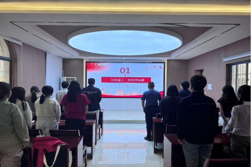 仪式第一项 , ,,,,全体起立 , ,,,,奏唱国际歌 , ,,,,激昂的旋律中 , ,,,,开班仪式正式拉开帷幕。。 。。。