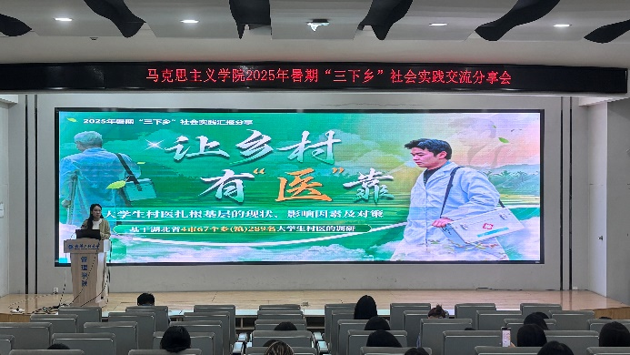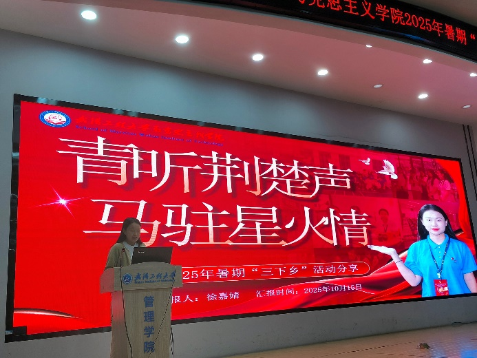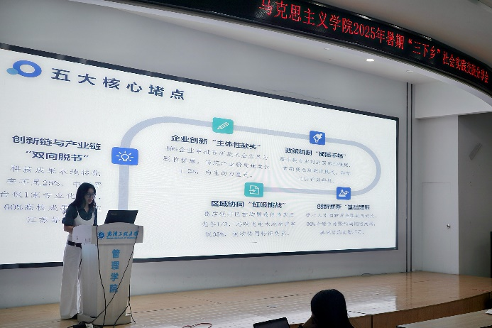 分享会第一阶段以“实践效果交流”为焦点,,,,,五支暑期“三下乡”实践团代表依次上台讲话,,,,,用鲜活案例与生动细节,,,,,展现马院学子在实践中的继续与生长。。。。。