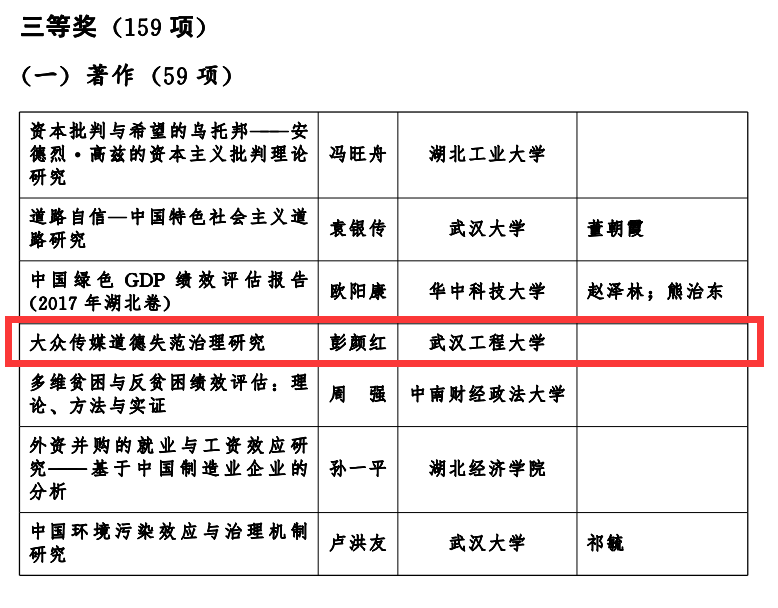 我院副教授彭颜红博士在人民出书社出书的专著《公共传媒品德失范治理研究》喜获第十二届湖北省社会科学优异效果奖三等奖,,,,,,,这是我校今年该奖项唯一的获奖作品。。。。。克日,,,,,,,湖北省人民政府揭晓了第十二届湖北省社会科学优异效果奖的转达(鄂政发[2020]24号),,,,,,,宣布了本届获奖作品,,,,,,,并希望全省宽大社会科学事情者为谱写湖北高质量生长新篇章作出更大孝顺。。。。。
