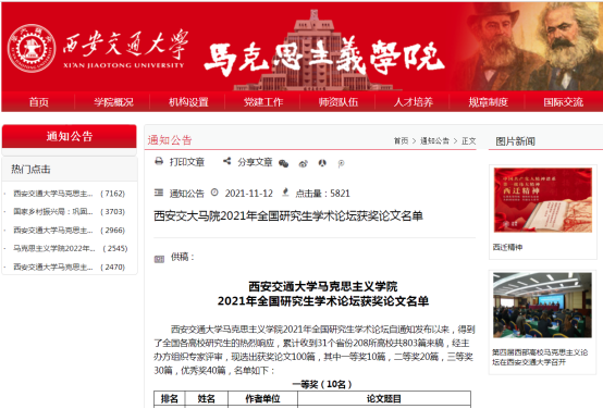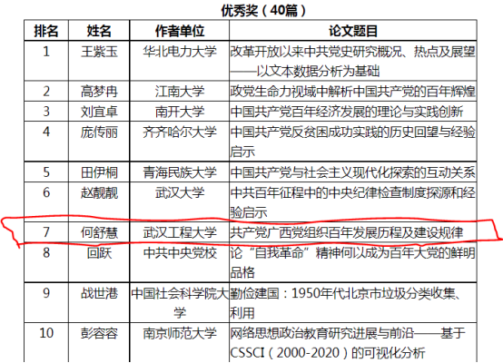 (通讯员蔡明广)克日,,,,,我院2020级硕士研究生何舒慧(导师为何景春教授)撰写的论文《共产党广西党组织百年生长历程及建设纪律》在西安交通大学6731顶级娱乐2021年天下研究生学术论坛获得优异奖。。。。。据悉,,,,,本次论坛共收到包括中共中央党校、清华大学、武汉大学、南京大学、中国人民大学、南开大学、吉林大学、兰州大学、华南师范大学、陕西师范大学、西南大学在内208所高校(81个单位具有马克思主义理论学科博士点)研究生提交的论文803篇。。。。。经主理方组织专家评审,,,,,共评选出获奖论文100篇,,,,,其中一等奖10篇,,,,,二等奖20篇,,,,,三等奖30篇,,,,,优异奖40篇。。。。。何舒慧同砚提交的论文获得优异奖,,,,,进入前100名。。。。。