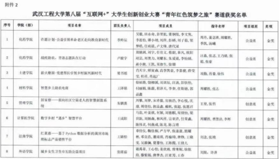(通讯员:肖雅钰 雷翊君)为作育立异创业人才,,,,,一连引发大学生立异创业热情,,,,,展示立异创业效果,,,,,立异创业学院、教务处、学生处、校团委、研究生院团结主理了武汉工程大学第八届“互联网+”大学生立异创业大赛。。。。。。。。经学院推荐、校赛组委会组织专家评审,,,,,最终评出高教主赛道金奖项目75个、银奖项目115个、铜奖项目127个;;;;;;;“青年红色筑梦之旅”赛道金奖项目10个、银奖项目17个、铜奖项目19个;;;;;;;工业赛道金奖项目7个、银奖项目11个、铜奖项目13个。。。。。。。。我院喜获高教主赛道研究生首创组校级金奖1项、“青年红色筑梦之旅”公益赛道校级金奖、校级银奖各1项。。。。。。。。