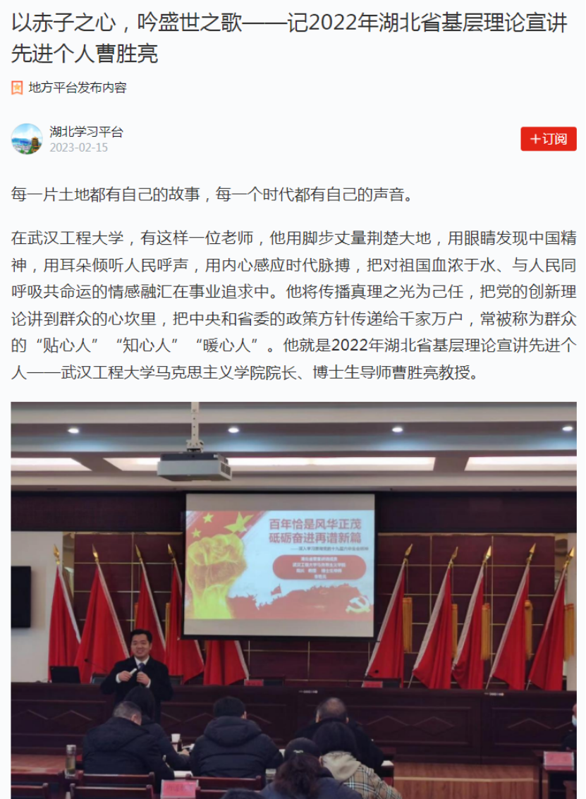 2月15日,,,,,我院院长曹胜亮教授登上“学习强国”平台《宣讲风范》栏目,,,,,施展了先进典范的树模引领和正向激励作用,,,,,引起了公共和媒体的普遍关注。。。。。。。。